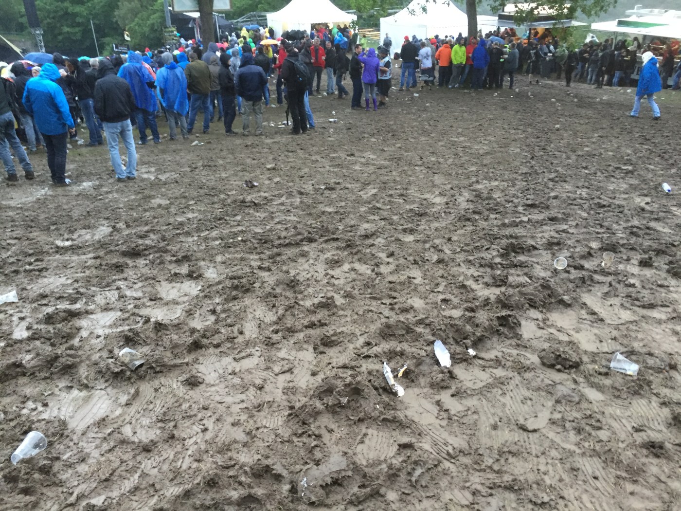 Ewiges Warten am Eingang in tiefem Schlamm: Dass der Boden aufweichen und unter tausenden von Füßen zu rutschigem Matsch werden würde, war auch nach Tagen Dauerregen offensichtlich für den Veranstalter nicht vorhersehbar! Und den Eingang mal fünf bis zehn Meter runter zum Parkplatz verlegen, wo man auf Aphalt hätte warten können, war offensichtlich auch nicht möglich…