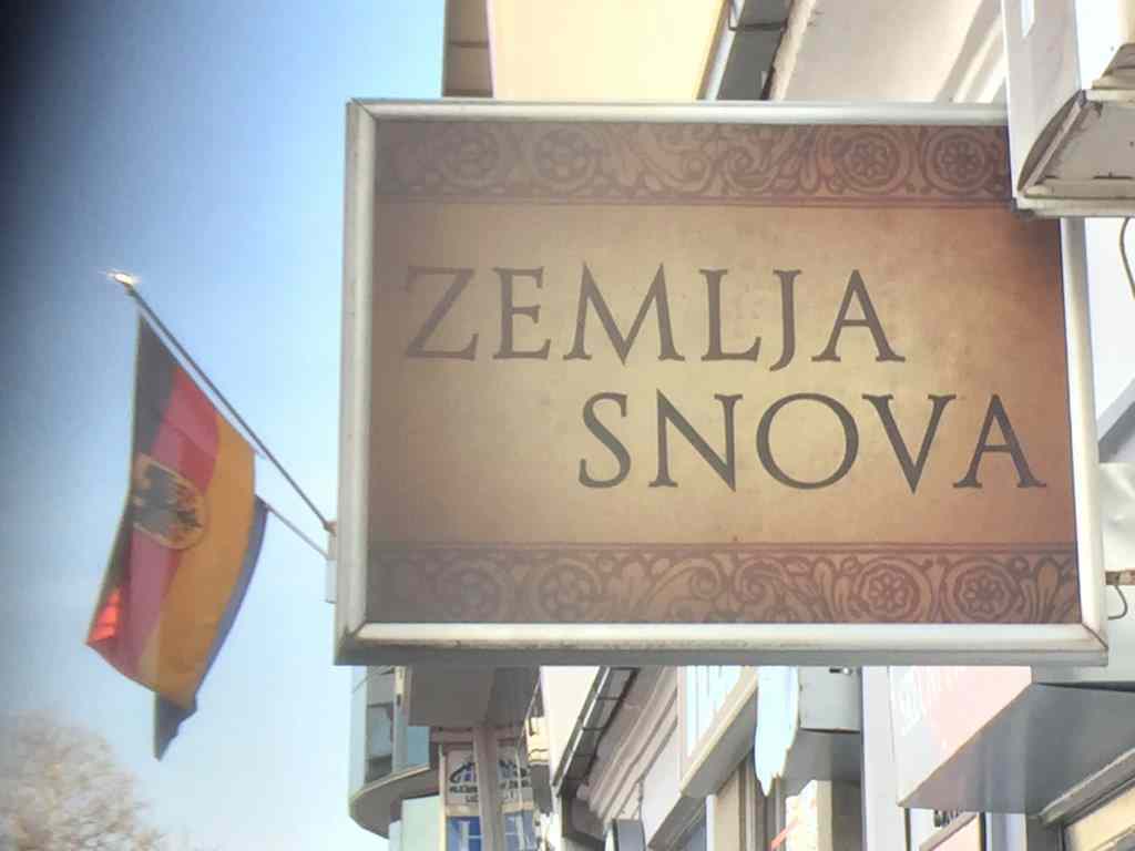 „Zemjla snova“ ist das das Reklameschild eines Ladens, der Spezialitäten und Accessoires aus Indien verkauft. Und man kann sein Schild deshalb zusammen mit der deutschen Fahne fotografieren, weil sich die deutsche Botschaft gleich daneben in der Fußgängerzone der montenegrinischen Hauptstadt Podgorica befindet.