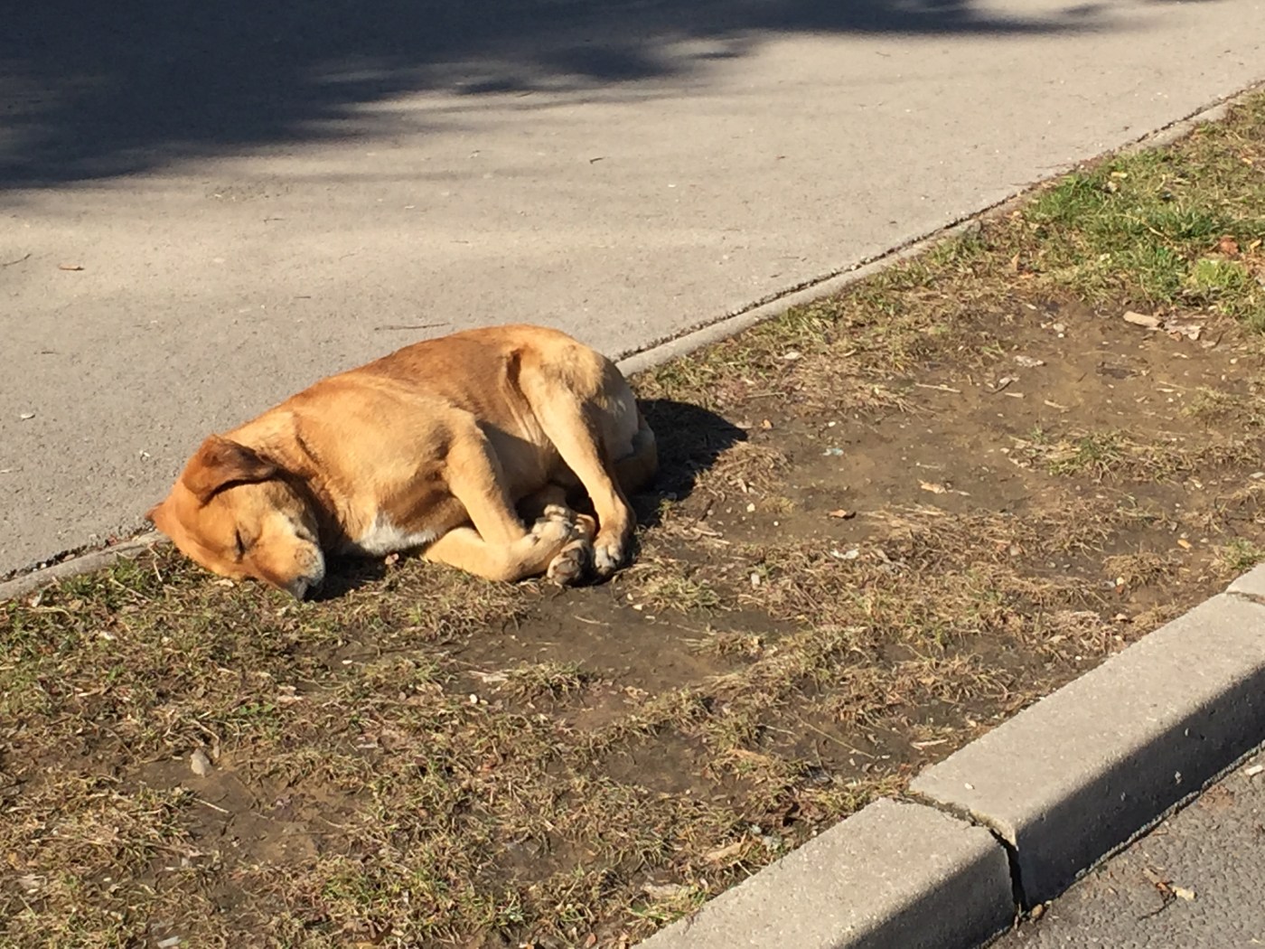 Auf dem Weg dahin kurzes Erschrecken. Auf dem Gehweg vor dem Fakultätsgebäude liegt ein regloser Hund.
