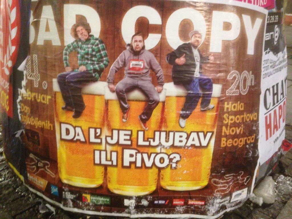Drei Herren auf drei gut gefüllten Bierkrügen auf einem Plakat in Belgrad: