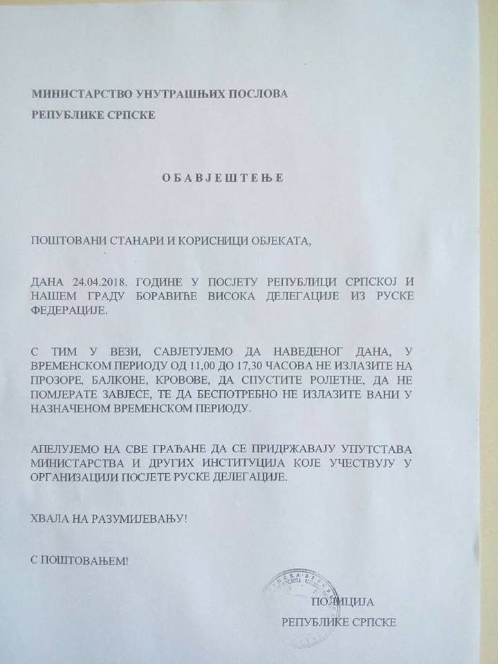 Per Mail erreicht uns der Scan einer Benachrichtigung des Innenminsteriums der Republika Srpska aus diesem Anlass. Darin ist zu lesen: