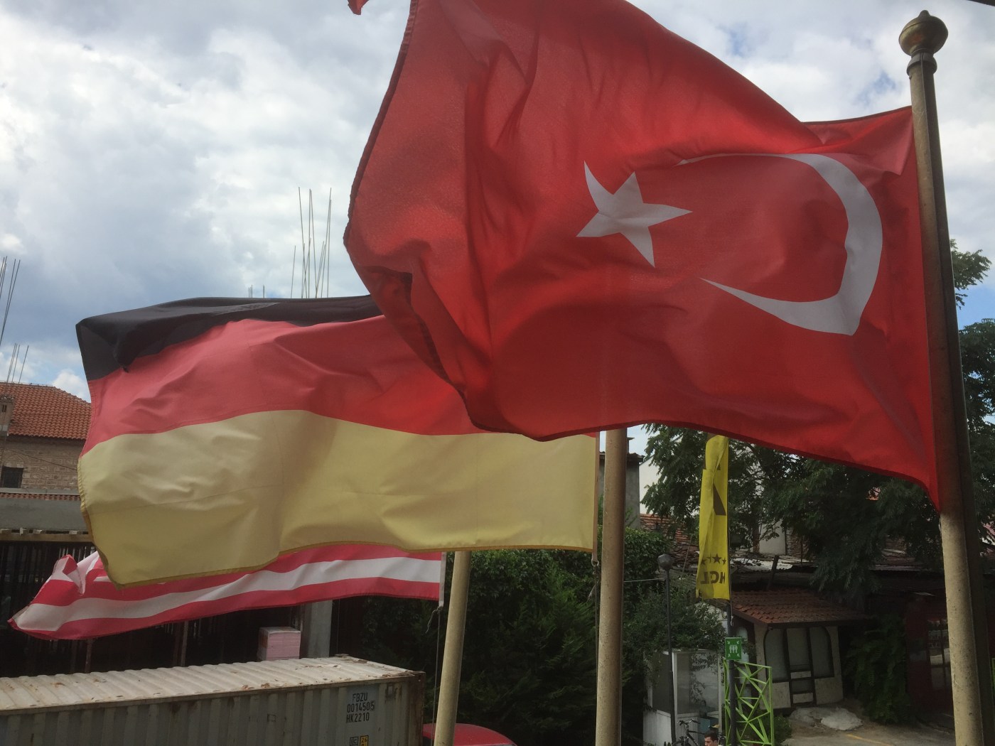 Von Skopje aus gesehen scheinen die deutsch-türkischen, aber auch die die deutsch-amerikanischen Beziehungen so harmonisch, dass man die Flaggen dieser Staaten nebeneinander hängen kann und sich diese im Einklang miteinander wiegen.