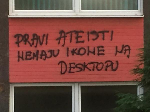 Simon & Carfunkel singen davon, dass die Worte der Propheten auf den U-Bahnwänden zu lesen sind. Es gibt aber auch Atheisten, die zur Sprühdose greifen und weltanschauliche Botschaften verbreiten. Diese hier hat uns besonders gefallen: Richtige Atheistien haben keine Ikonen auf dem Desktop Schöne Grüße aus Bosnien in das Silicon Valley! (Falls dort noch jemand... Continue Reading →
