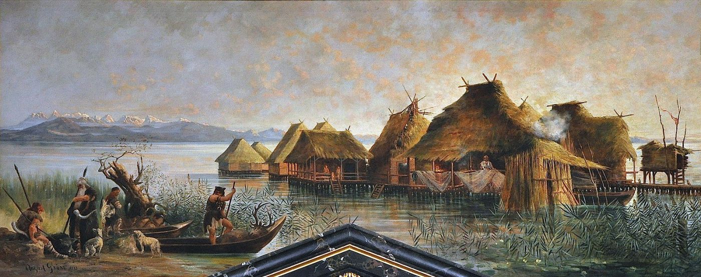 Beitragsbild: Pfahlbauten in Slowenien, Gemälde von August Grosz, Wikimedia Commons, Fotograf James Steakley