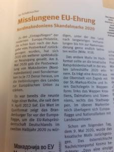Actually, another stamp was intended to be positive, focusing on the relations of North Macedonia, which wants to join the EU, with the European Union. To mark the occasion, last year they issued two stamps dedicated to the two states that held the presidency of the Council in 2020. Apart from Germany, this was also Croatia. However, a big and somehow incomprehensible mistake was made with the stamp in question. Instead of Croatia`s today’s national territory, th the outlines of the fascist state „Independent State of Croatia“ , which existed during the Second World War and also extended into the national territory of Bosnia and Herzegovina and Serbia. No wonder, that protests from these states followed.
