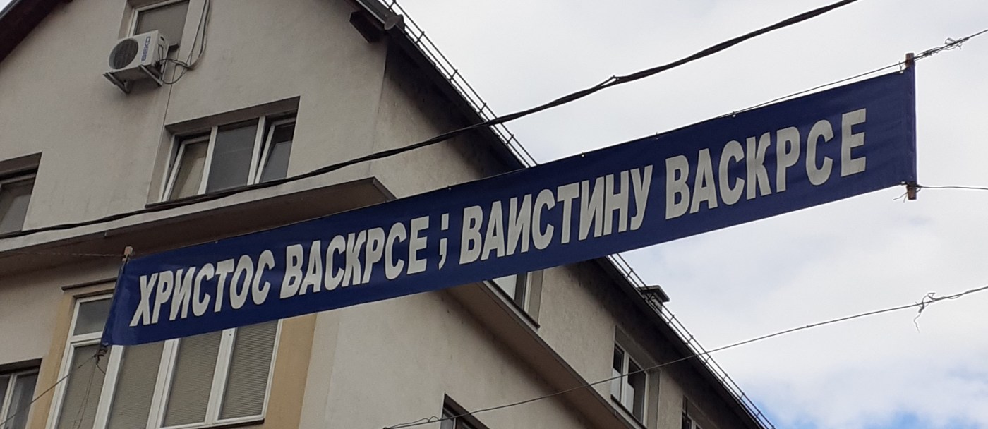 This Easter greeting is hanging in Travnik, Bosnia and Hercegovina, across the main street, on which posters advertise menus for breaking the fast in the Muslim fasting month of Ramazan, not far away from a billboard which recomments a local Catholic school.