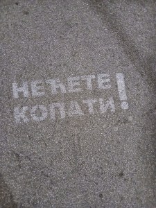 In Belgrad finden sich Slogans Protestierende auf dem Gehsteig. Sie haben jedoch nichts mit den Ereignissen in Novi Sad zu tun, sondern mit einem anderen Thema, das gegenwärtig Anlass von Protesten ist: Der geplante Abbau von Lithium.