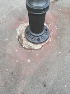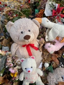 Davor, ebenso wie an einigen anderen Stellen der Stadt, verdorrte Blumen, leere rote Plastikbehälter, die einmal Kerten beinhaltet haben, Stofftiere , Fotos der verstorbenen und handgeschriebene Nachrichten. Beispielsweise solche: