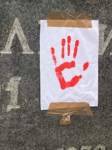 Und überall Abdrücke von roten Händen. Sie klagen an, dass an den Händen der Verantwortlichen Blut klebt.